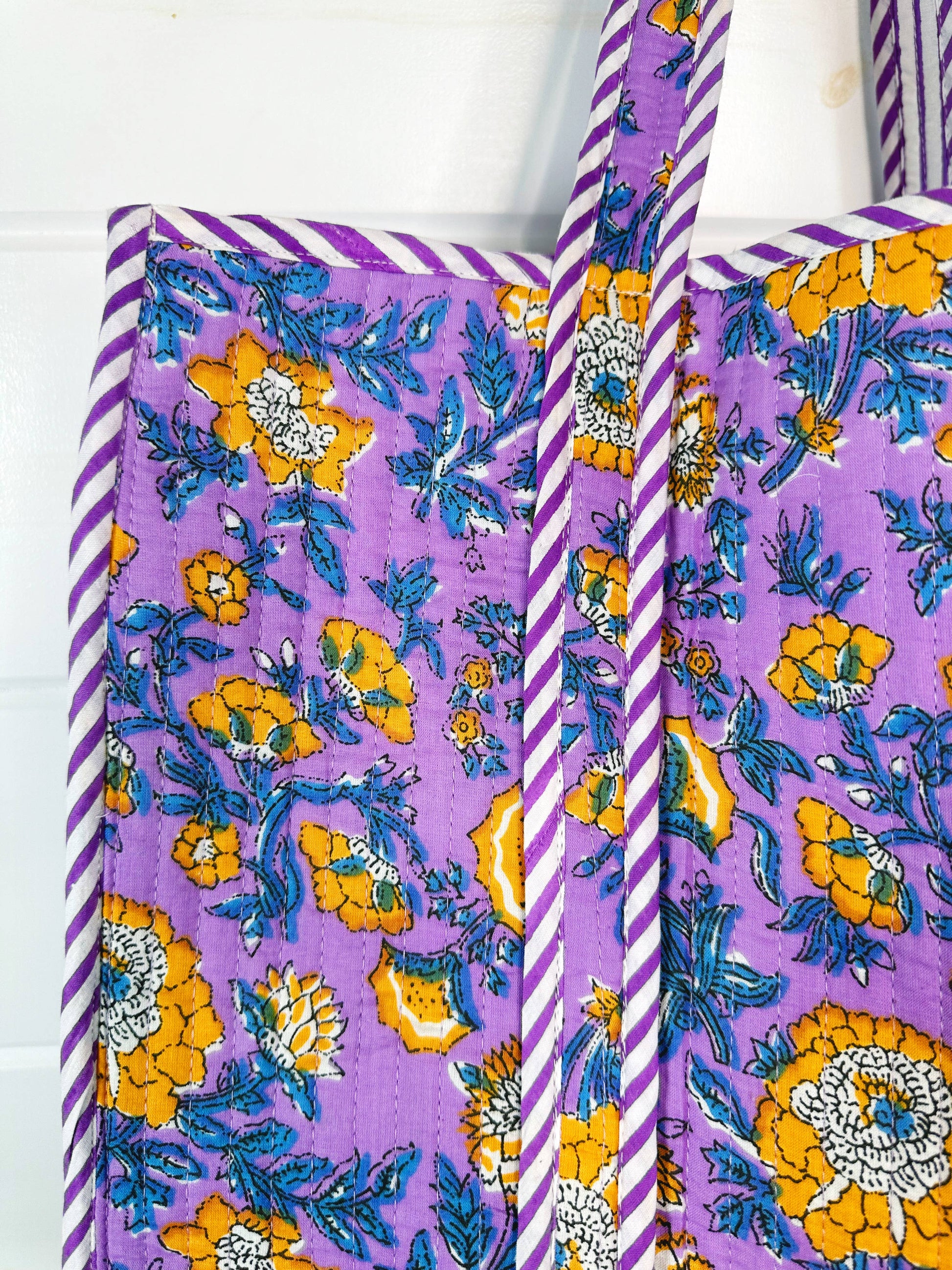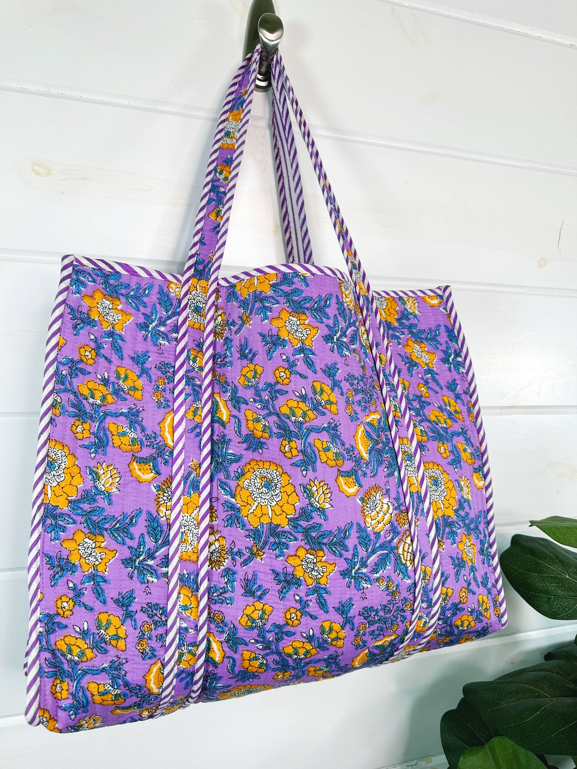 Purple and Yellow Floral Print Oversized Quilted Tote Bag - Reversible tote with contrasting interior - Interior pocket - 17.5" x 17.5" - 100% Cotton - Quilted block print fabric Perfect for: market tote, beach tote bag, weekender bag, overnight bag, large shopping tote, travel bag & more!